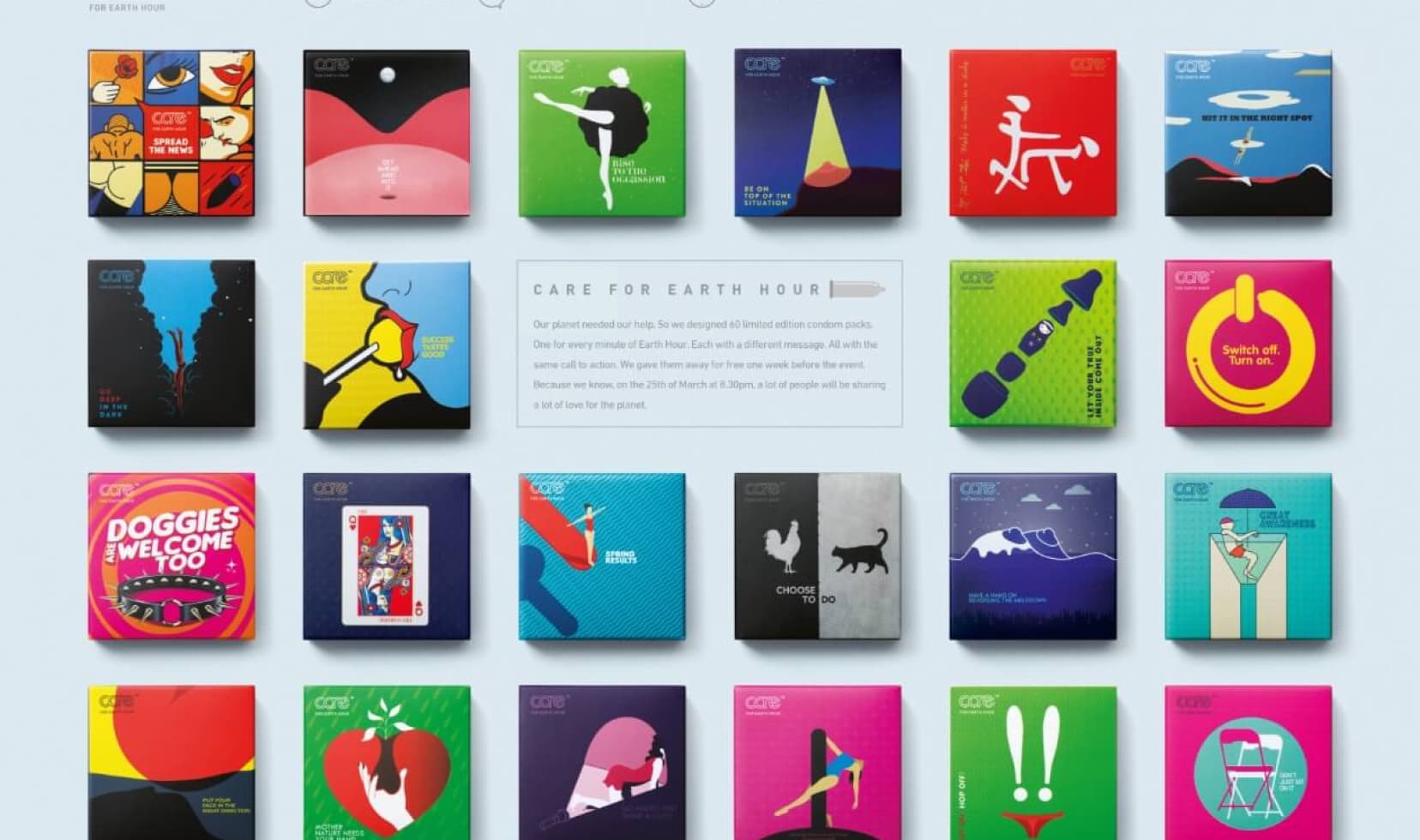 A total of 60 designs were produced, one for every minute of earth hour, and each of the packs carried a different message.
